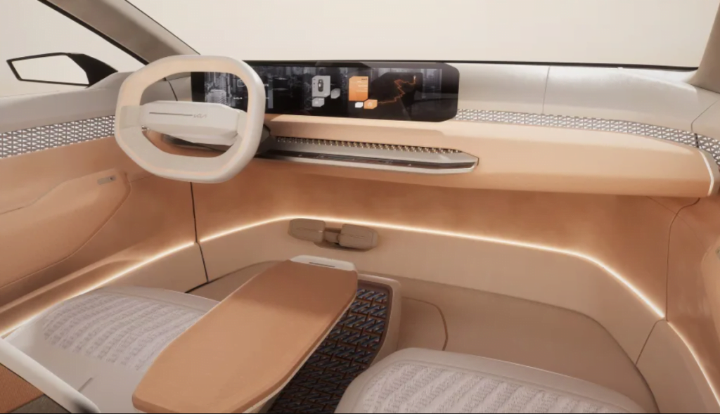 The Concept EV4 is a clean-sheet design emphasizing sportiness and strong geometric shapes. The interior is broadly the same as the Concept EV3, but an “HVAC user interface incorporates a control panel that can be neatly stored in the center console when not in use,” according to Kia.